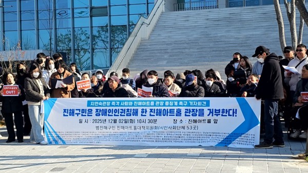 20251202-장애비하발언 진해아트홀 관장 사퇴 기자회견 페이지 정보 작성자 진해인권센터 댓글 0건 조회 18회 작성일 26-04-16 16:46 목록 답변 본문 . 이전글20251209-경남장애인복지관 직장내 장애인식개선 교육 26.04.16 다음글20251128-한국특수전지 직장내 장애인식개선 교육 26.04.16 댓글 0 댓글목록 등록된 댓글이 없습니다.