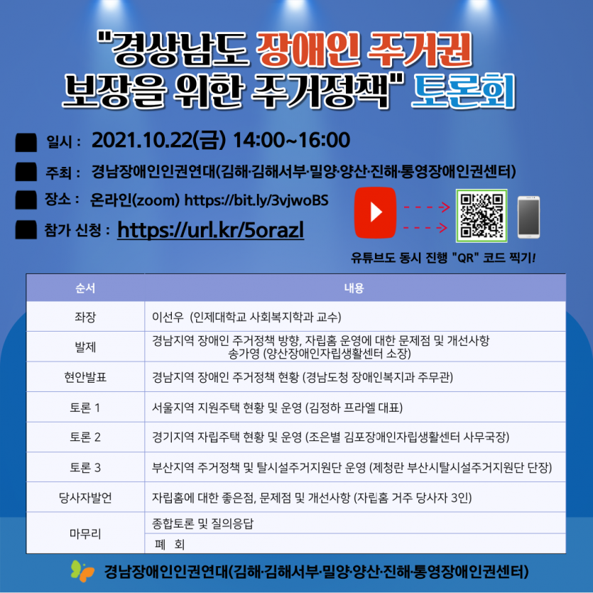 경상남도 장애인 주거권 보장을 위한 주거정책 토론회를 온라인 개최합니다.
