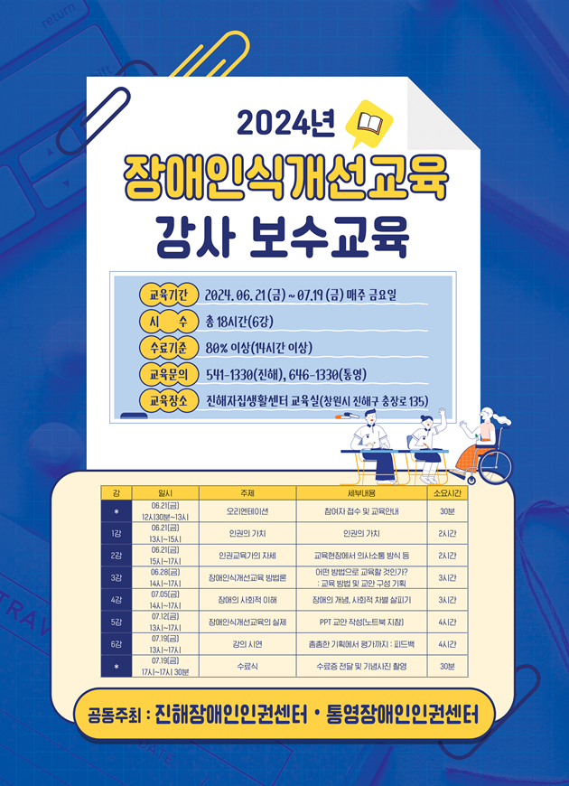 본 단체는 통영장애인인권센터와 공동주최로 <2024년 장애인식개선교육 강사 보수교육>을 진행하고자 합니다.