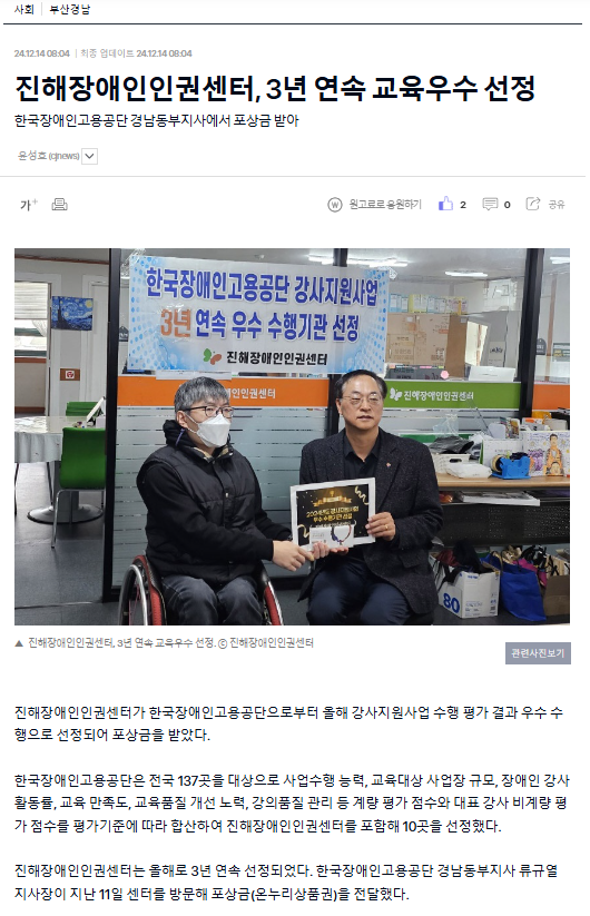 2024년 한국장애인고용공단 강사지원사업 평가 우수 교육기관 선정 (3년연속) 페이지 정보 작성자 진해인권센터 댓글 0건 조회 41회 작성일 26-04-07 16:44 목록 답변 본문 2024.12.11 다음글2024년 제 7회 진해장애인인권영화제 <2024 창원시장애시민공감 축제> 개최 26.04.07 댓글 0 댓글목록 등록된 댓글이 없습니다.